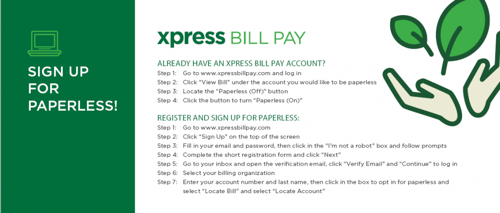 When you sign up for online bill payment you get a unique password that you use to access your personal account at XpressBillPay.com. Every quarter we’ll send you a reminder e-mail to let you know when your bill is online.